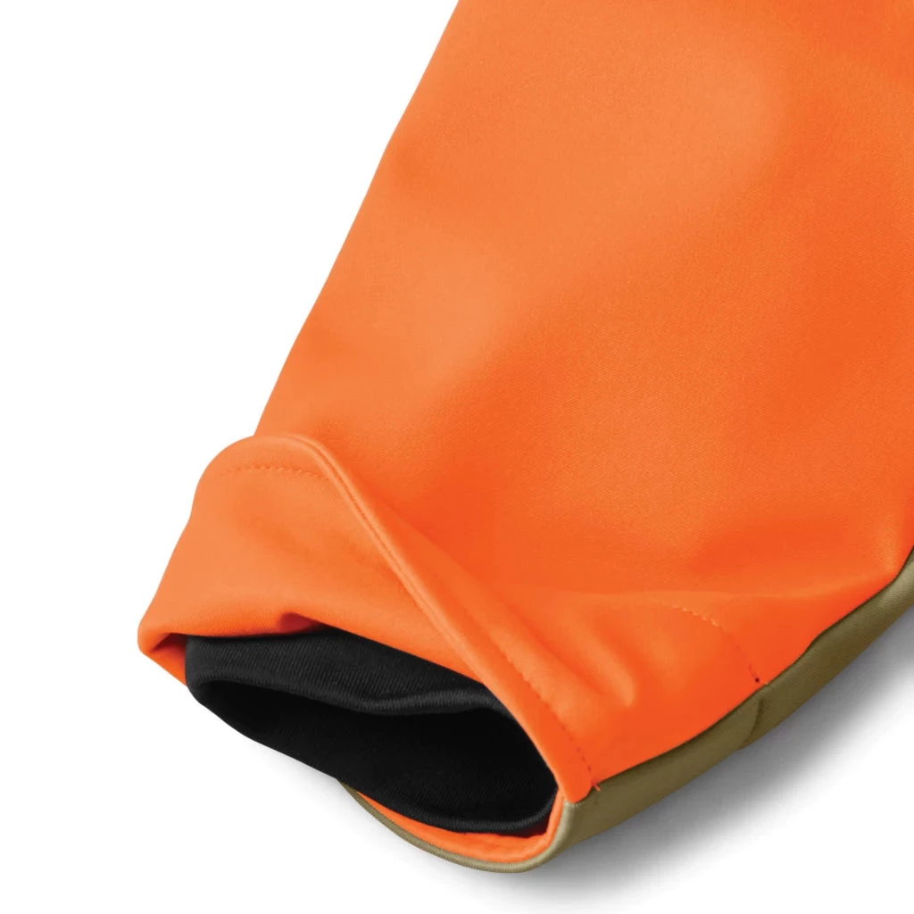 The popular Upland Hunting Softshell Jacket brings hunters the perfect combination of moisture management, thicket protection, breathability, and mobility. Unrestricted shooting movement was at top of mind when we designed the fit and details of this jacket. The low-profile, Napoleon-style pockets have been improved to lie flat on both sides to cater to both right- and left-handed shooters. The tightly woven shell stands up to brush and is now DWR-treated for additional water resistance. Inside, the shell features a soft brushed tricot liner. Blaze accents have been increased to over 1000 sq. inches for greater safety afield. External contour cuffs protect the back of your hands and the internal wind cuffs cut the breeze and keep out debris. Underarm zips allow for extra ventilation. Adjustable drawstring in hem. Washable. Imported.